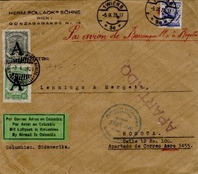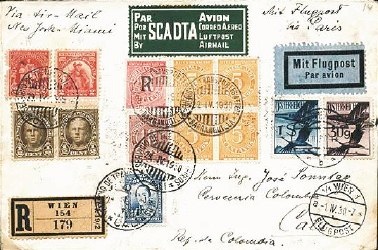 Der untere Brief besitzt neben den österreichischen Marken und den Marken der Allgemeinen Ausgabe (bis hierhin wäre der Brief ohne Beanstandung sammelwürdig) auch noch eine kolumbianische Nationalmarke und vier US-amerikanische Nationalmarken (diese alle mit Scadta-Cali-Ortstempel). Diese Nationalmarken waren überhaupt nicht erforderlich, wurden wahrscheinlich nachträglich vom Empfänger aufgeklebt und anschließend durch die Scadta-Agentur abgestempelt. Schade. Nur noch minderwertig und von ernsthaften Philatelisten sicherlich zu meiden.