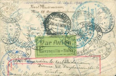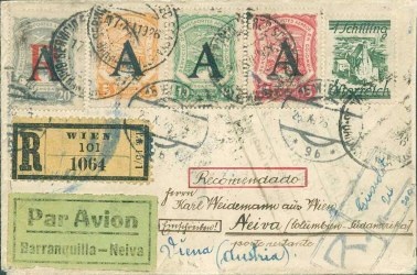 Einziges bei scadta.de registrierte Einschreiben mit fehlender Konsular-Einschreibmarke und daher Nachgebührenstempel 20 Centavos. Gleichzeitig einzige Karte und einzige Sendung nach Ekuador. Österreich-Rarität!