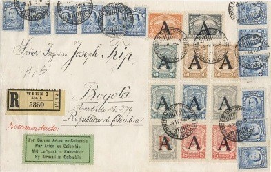 Kolumbianische Marken der ersten Ausgabe ohne besondere Kennzeichnung sind im Ausland benutzt nur noch vom Deutschen Reich bekannt. Interessant ist besonders die frühzeitige Verwendung des Einkuvertverfahrens, sicher ohne vertragliche Grundlage. Dieser hier ist an Dr. Peter Paul von Bauer gerichtet, was die ungewöhnliche Frankatur erklären mag. Österreich-Rarität ersten Ranges.