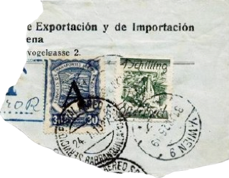 Der obere ist im Zwei-Kuvertverfahren versendet worden, welches zu dem Zeitpunkt längst nicht mehr aktuell war. Zusätzlich wurde die nicht zur Verfügung stehende Einschreibmarke durch eine gewöhnliche 20-Centavos-Marke ersetzt und mit einem „R“ handschriftlich (wie üblich) gekennzeichnet. Dieser Brief ist sammelwürdig, zumal er frankaturgerecht ist.